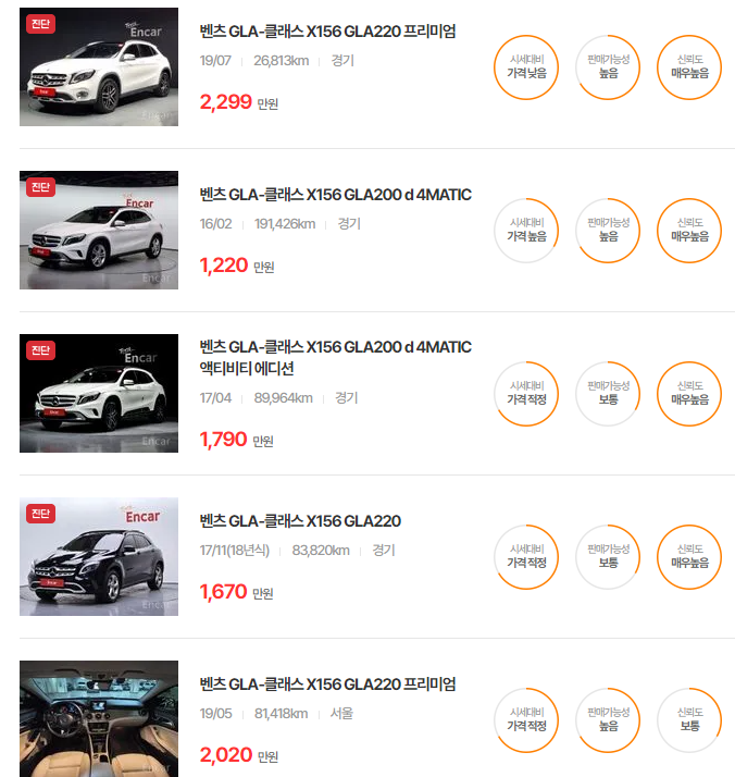 벤츠 GLA-클래스 중고차 가격