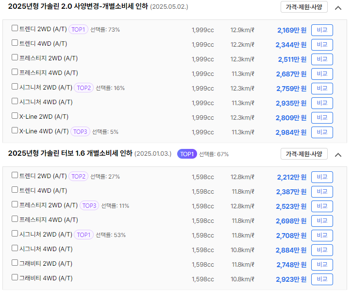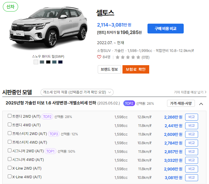 트림 및 옵션에 따라 가격이 달라질 수 있으며, 추가적인 옵션 선택에 따라 일부 가격 변동이 있을 수 있습니다. 따라서, 옵션 구성과 가격대를 비교해보면 나에게 맞는 트림을 찾기 쉬워집니다.