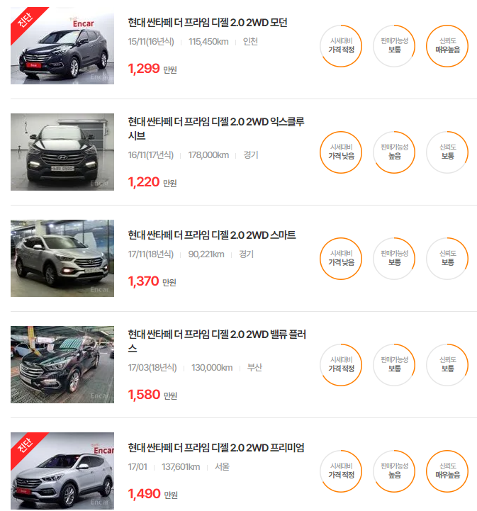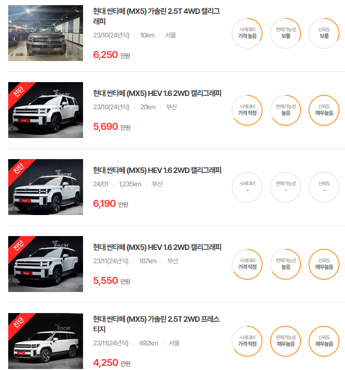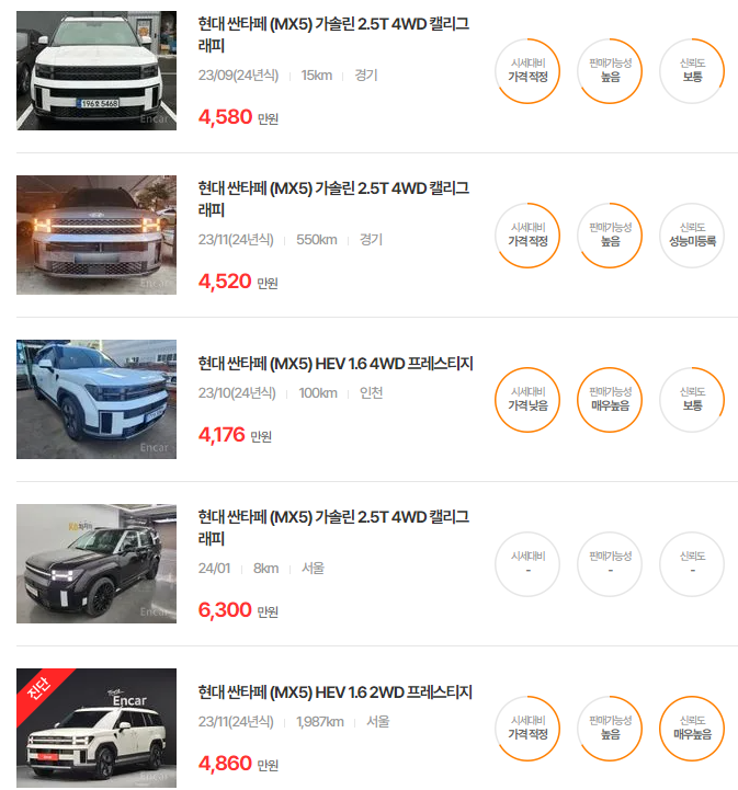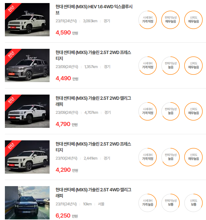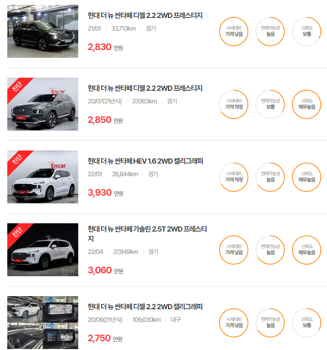 경제적인 선택을 고려한다면 싼타페 더 프라임이 가성비가 좋으며, 주행거리가 짧은 모델이 높은 가치를 지닙니다.