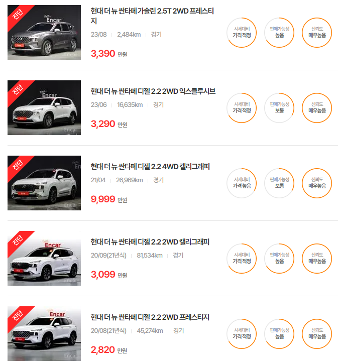 더 뉴 싼타페는 다양한 트림과 옵션을 제공하며, 주행거리가 적은 차량은 보다 높은 가격에 거래됩니다.