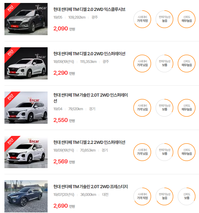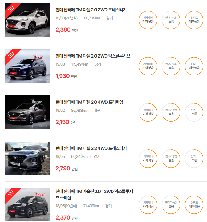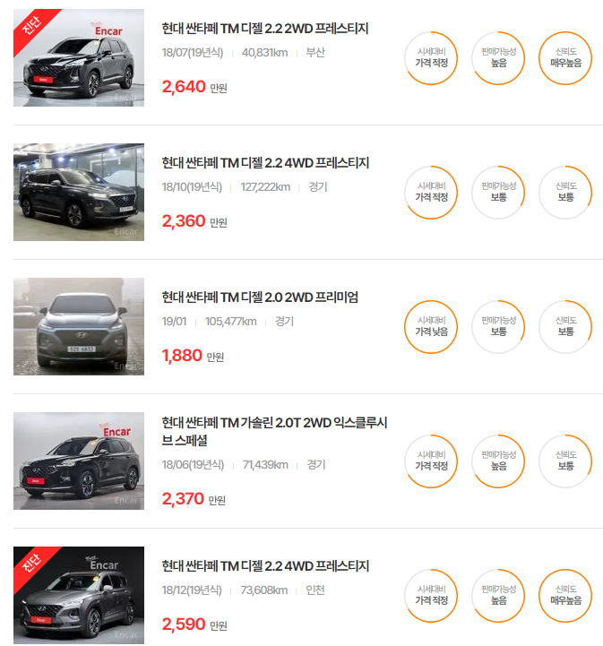 싼타페 TM은 실용성과 성능을 동시에 제공하며, 특히 2019년식의 인기가 높습니다. 주행거리 및 옵션에 따라 가격차가 발생합니다.