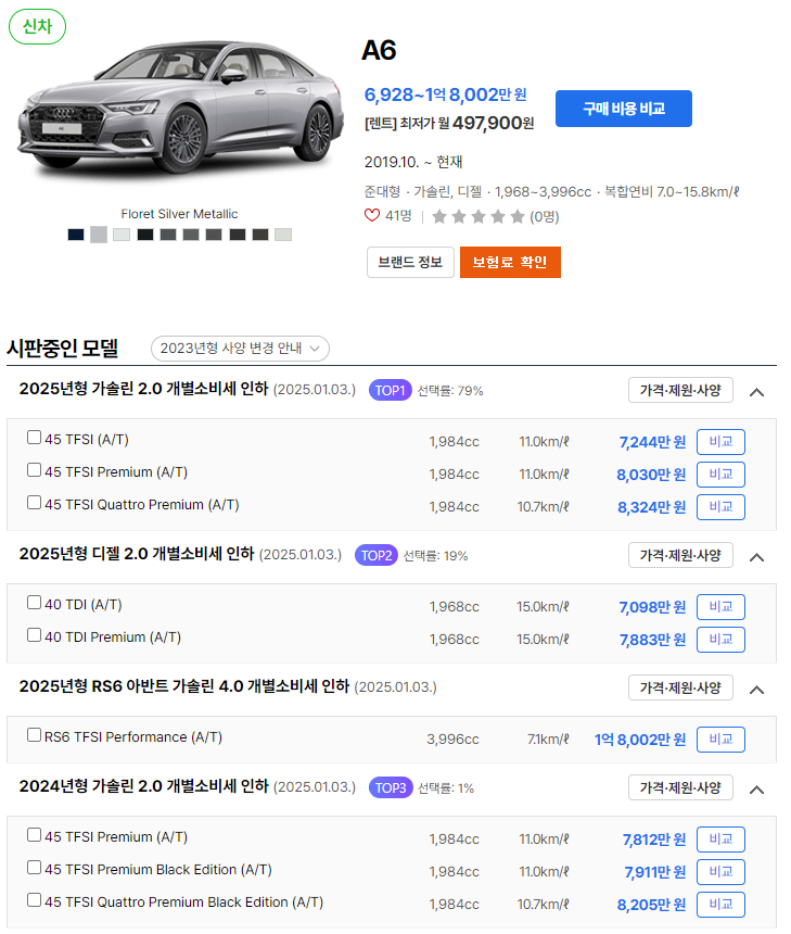 2025 아우디 A6의 가격은 다양한 트림과 옵션에 따라 다르게 책정됩니다. 대표적인 트림과 가격을 아래와 같이 정리합니다: