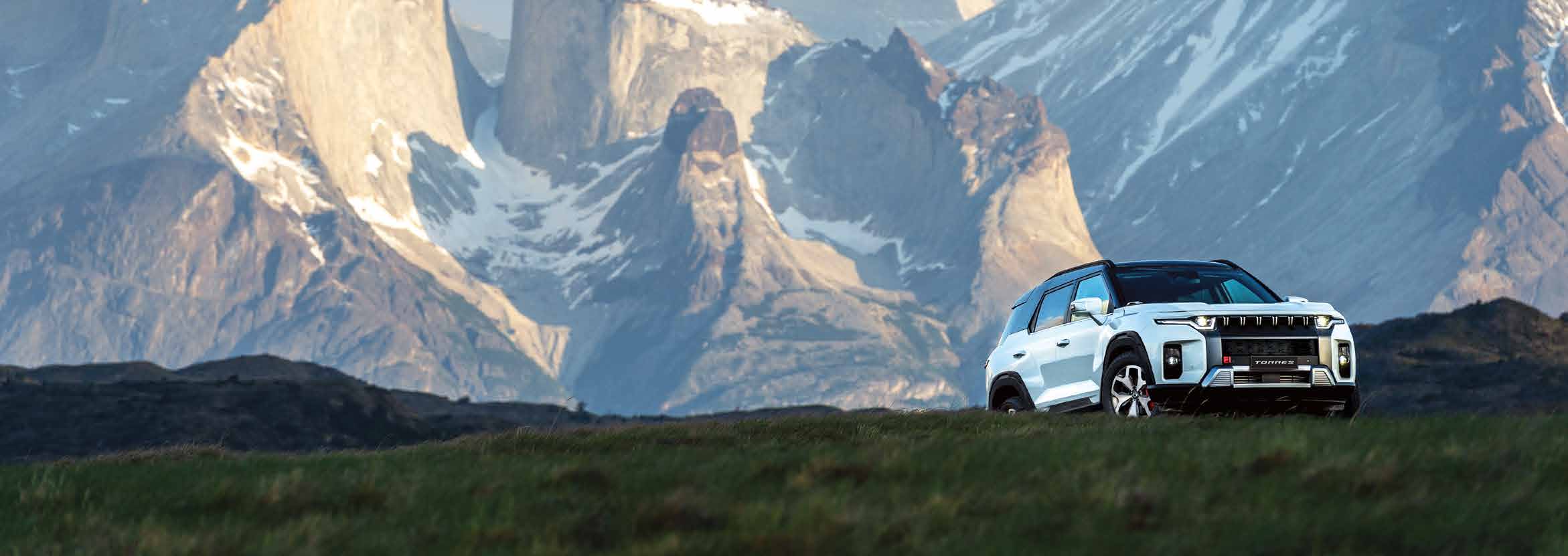 2025 토레스의 외관은 다이내믹한 라인과 대담한 프런트 그릴 디자인이 돋보이며, 전체적으로 강인한 인상을 줍니다.