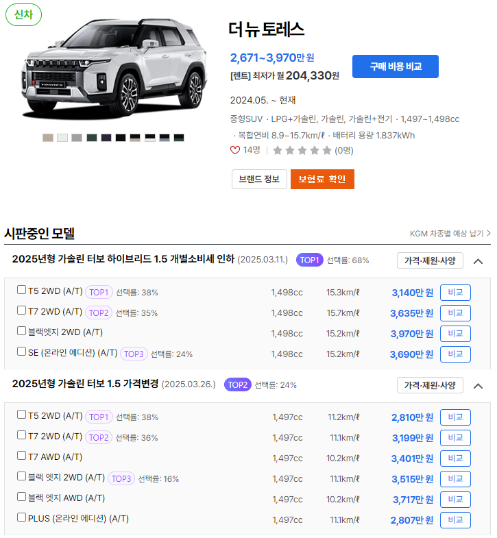 2025 토레스는 가격, 연비, 제원, 유지비 등의 다양한 정보 면에서 매력적인 선택지가 될 수 있습니다. 해당 차량 구매에 고민 중이시라면 위 정보를 참고해보시길 바랍니다.