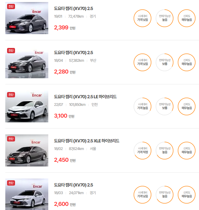 2017부터 2023년식까지의 캠리는 세련된 디자인과 안정적인 성능으로 큰 인기를 얻고 있습니다. 특히 2021년식은 주행 거리와 옵션에 따라 가격 차이가 크게 나며, 연식에 따라 자연스럽게 가격이 변화하는 특징을 보입니다.