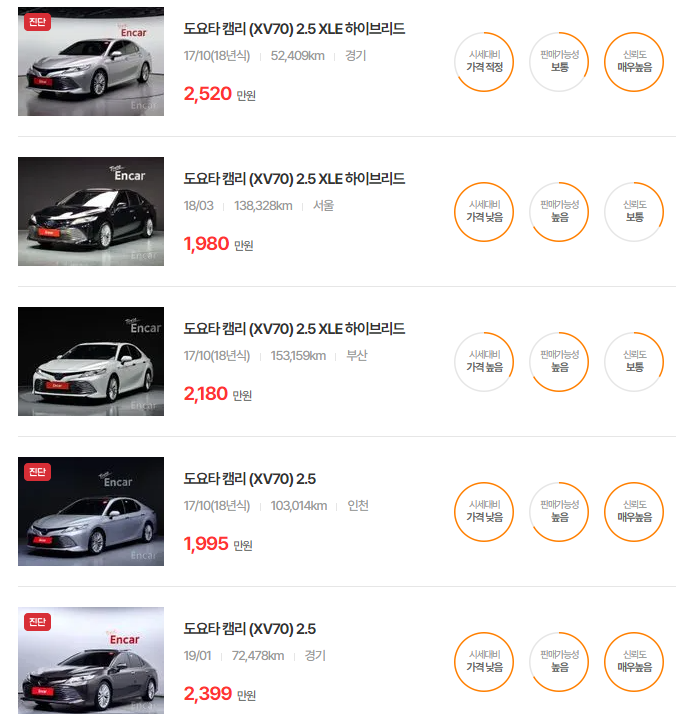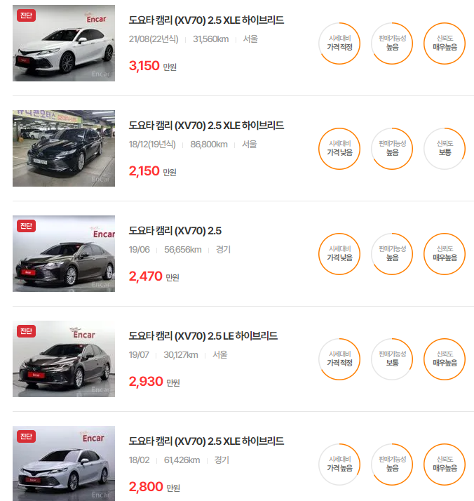 2017부터 2023년식까지의 캠리는 세련된 디자인과 안정적인 성능으로 큰 인기를 얻고 있습니다. 특히 2021년식은 주행 거리와 옵션에 따라 가격 차이가 크게 나며, 연식에 따라 자연스럽게 가격이 변화하는 특징을 보입니다.