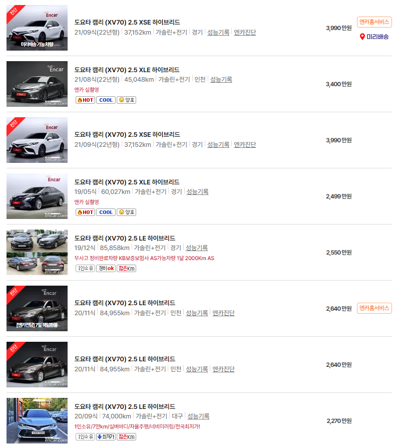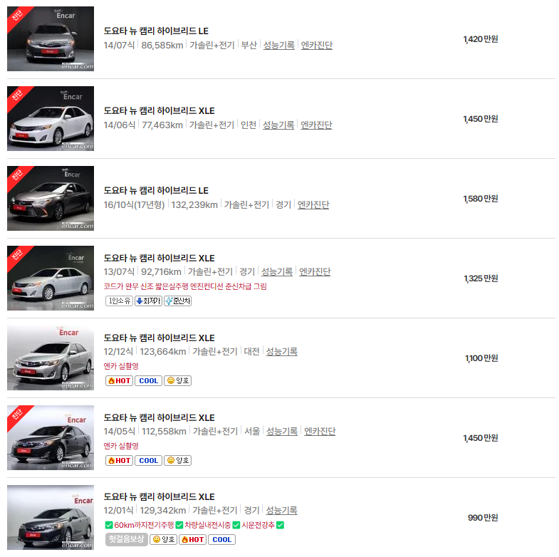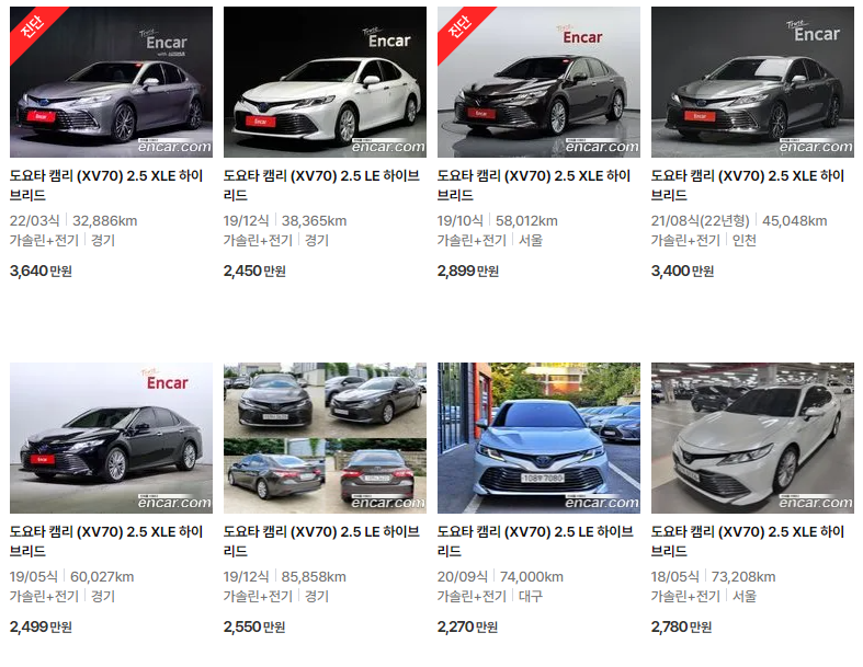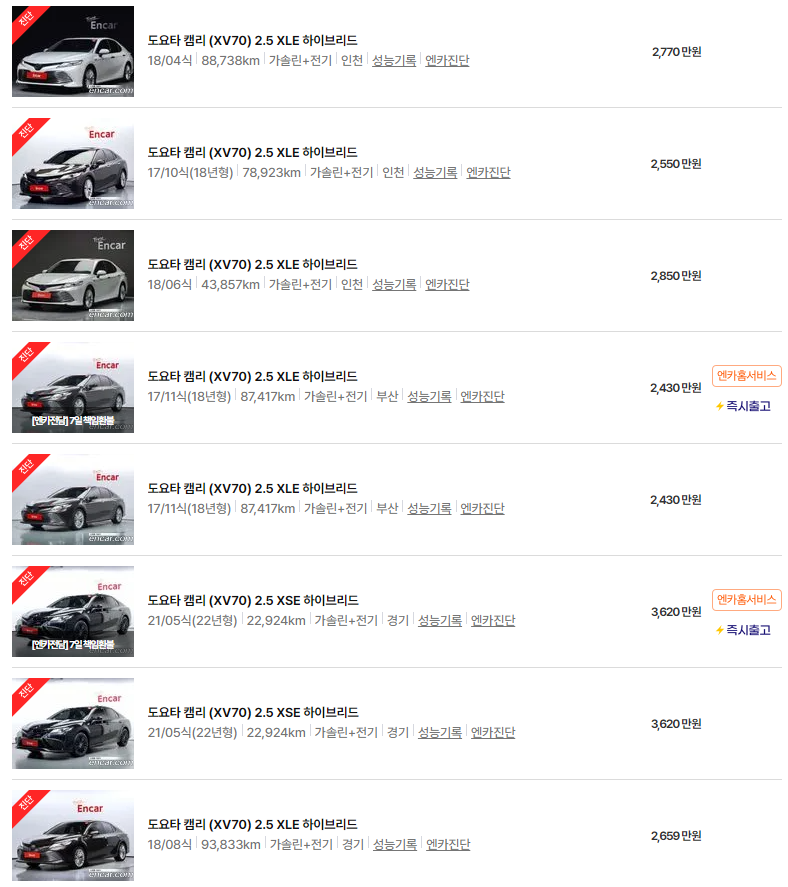 | 토요타 뉴 캠리 중고차 가격 시세표 (0) | 2025.06.17 |
